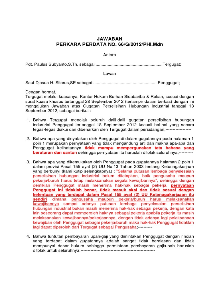 Dengan ini mengajukan jawaban atas Gugatan Perselisihan Hubungan Industrial tanggal 18 September 2012 sebagai. Demikianlah jawaban Tergugat terhadap Gugatan Penggugat. Contoh Jawaban Gugatan Perkara Perdata PMH recommended LORONG PABRIK Contoh Jawaban Gugatan Perkara Perdata PMH recommended.