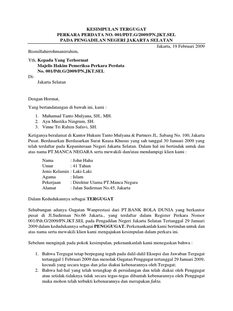 Contoh Kesimpulan Tergugat Wanprestasi Pengadilan Negeri Jakarta Selatan