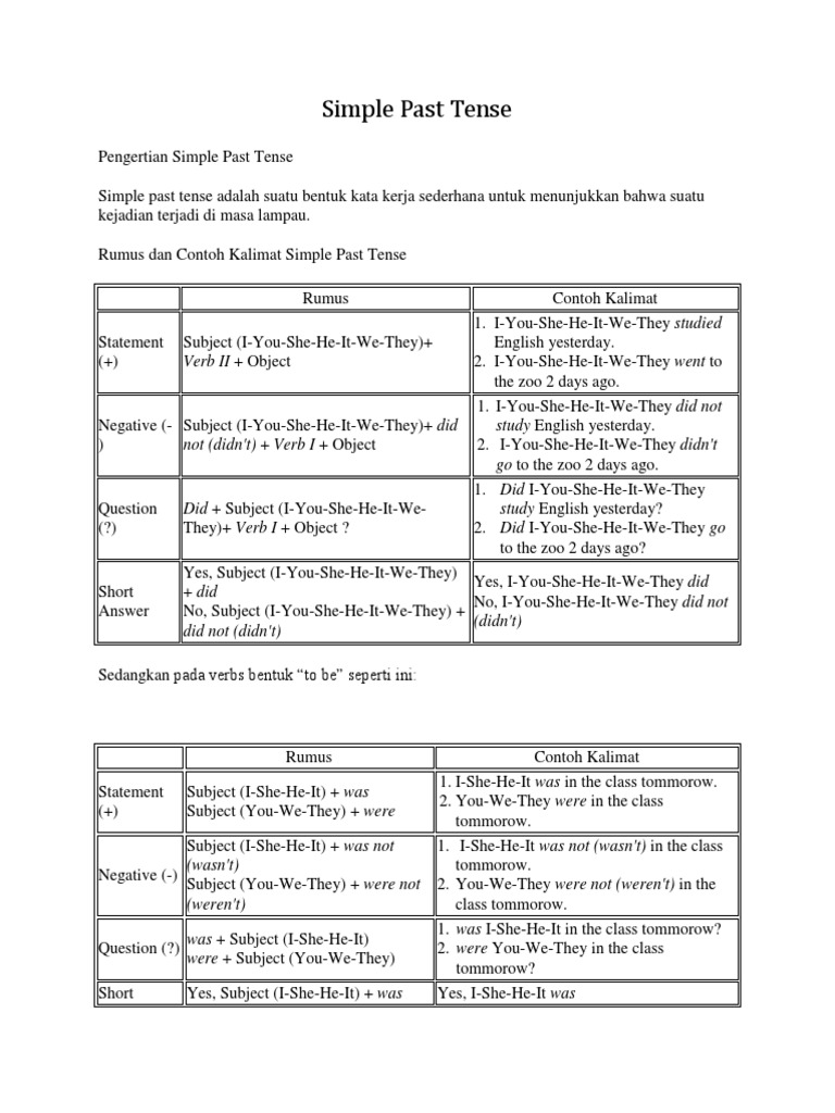Simple past tense adalah sebuah tense yang digunakan pada saat kegiatan yang terjadi di masa lampau dan sudah tidak ada lagi hubungannya dengan masa sekarang. Baik untuk kalimat positif negatif atau pun kalimat tanya. Rumus Simple Past Tense.