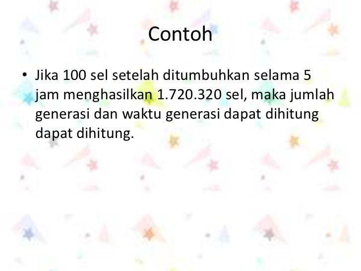 Contoh perhitungan Jumlah generasi log 1720320 log 1000301 14. Pertumbuhan mikroorganisme yang membentuk koloni dapat dianggap bahwa setiap koloni yang tumbuh berasal dari satu sel maka dengan menghitung jumlah koloni dapat diketahui penyebaran bakteri yang ada pada bahan. BAB VI PERKEMBANGBIAKAN PERTUMBUHAN MIKROBA 1.