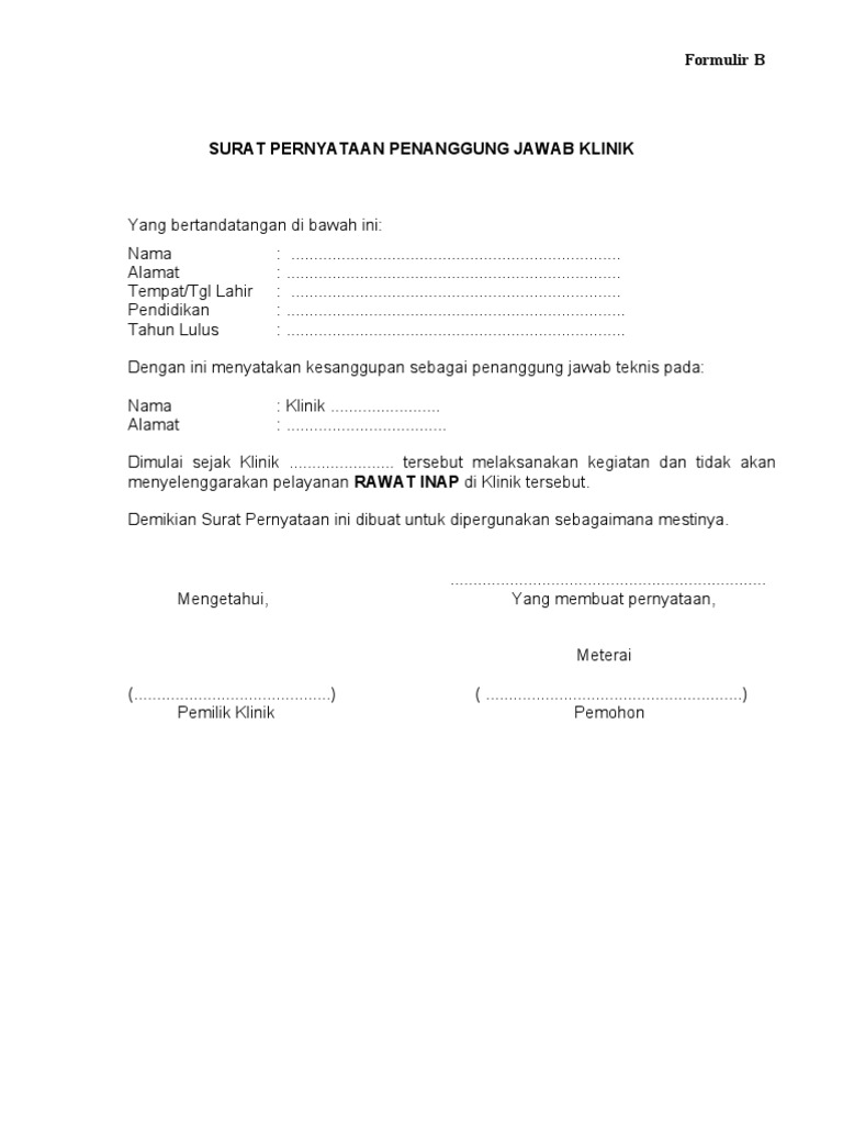 Formulir B Surat Pernyataan Penanggung Jawab Klinik