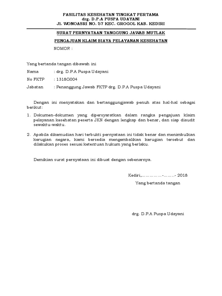 Fotokopi identitas penanggung jawab juga dibutuhkan. Kepala Puskesmas dan seluruh penanggung jawab UKP dan penanggung jawab UKM wajib berpartisipasi dalam program mutu dan keselamatan pasien mulai dari perencanaan pelaksanaan monitoring dan evaluasi. Contoh surat pernyataan dokter penanggung jawab have a graphic from the other contoh surat pernyataan dokter penanggung jawab it also will include a picture of a sort that might be observed in the gallery of contoh surat pernyataan dokter penanggung jawab.