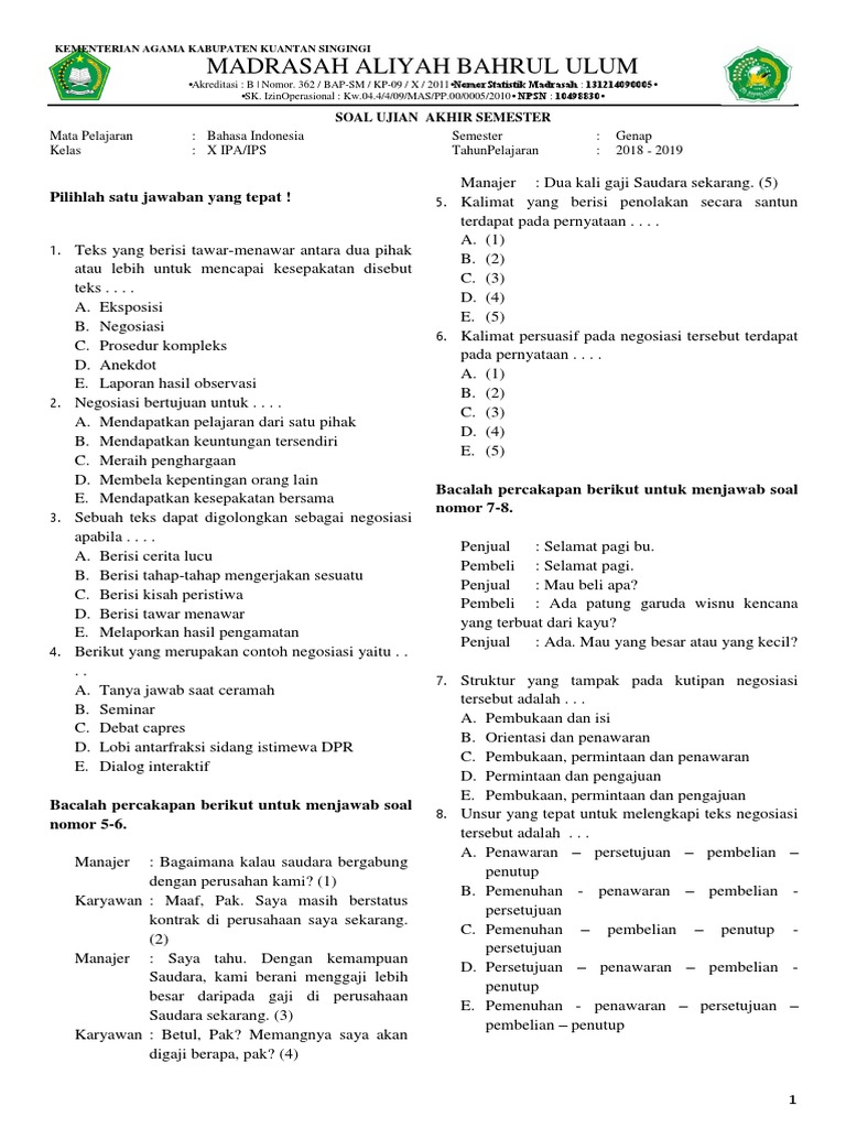 Latihan soal pilihan ganda materi teks negosiasi beserta jawaban perhatikan kutipan dialog berikut. Contoh Soal Bahasa Indonesia kelas 10 Semester 1 Berilah tanda silang x pada huruf a b c atau d di depan jawaban yang benar. Ada sekitar 50 butir soal pg pilihan ganda bahasa indonesia tentang teks negosiasi dan jawabannya yang bisa adik adik sma smk jadikan referensi dalam menghadapi ujian dari guru.