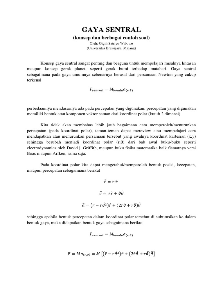 Gigih Satriyo Wibowo Universitas Brawijaya Malang Konsep gaya sentral sangat penting dan berguna untuk mempelajari misalnya lintasan maupun konsep gerak planet seperti gerak bumi terhadap matahari. Secara umum alat-alat ini bisa disebut sebagai mekanisme paling sederhana yang memanfaatkan keuntungan mekanik untuk menggandakan gaya. Bagaimana cara melakukan renang gaya bebas.
